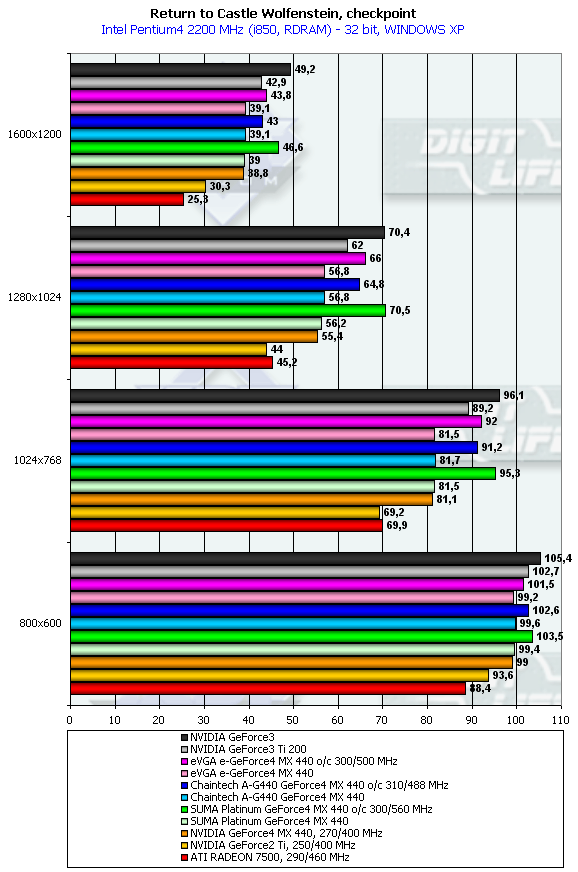 - Return to Castle Wolfenstein (MultiPlayer) (id Software/Activision) - OpenGL, мультитекстурирование, Checkpoint-demo, настройки тестирования - все на максимально возможном уровне, S3TC OFF, конфигурации можно скачать тут