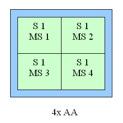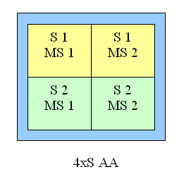 Давайте познакомимся с новым гибридным (MS и SS одновременно) режимом полноэкранного сглаживания, доступным для карт на базе GeForce4. Фактически, этот режим можно назвать "Мичуринским гибридом" — в каждом исходном 2х2 блоке сглаживания усредняется два расположенных друг над другом "подблока" (2х1), полученных стандартным для 2х MSAA образом (для сравнения справа приведен обычный 4х MSAA блок):