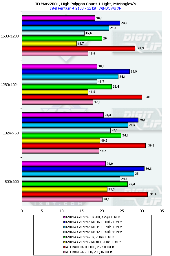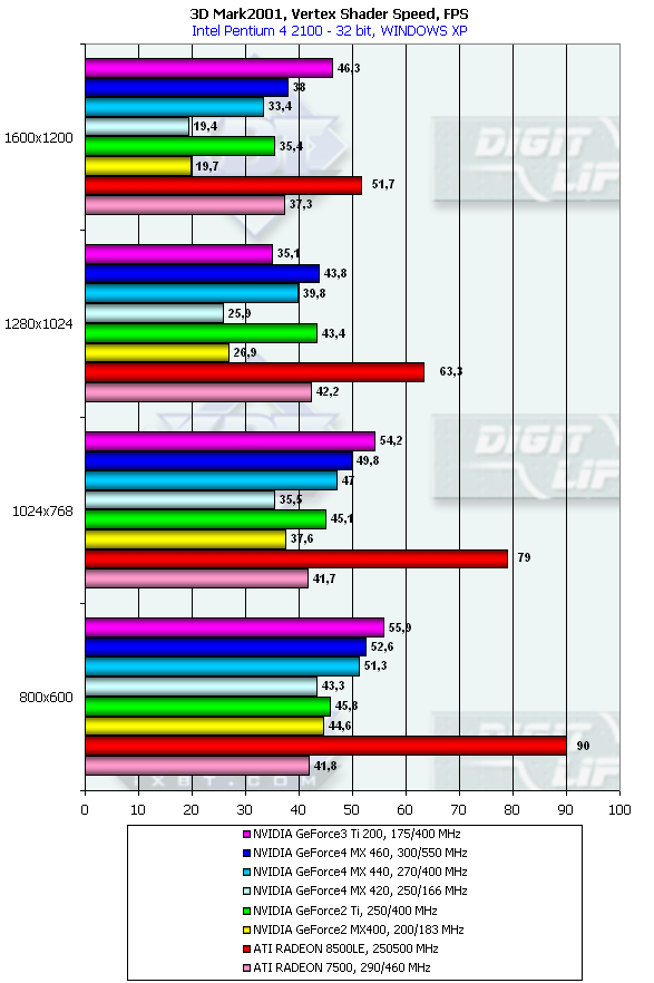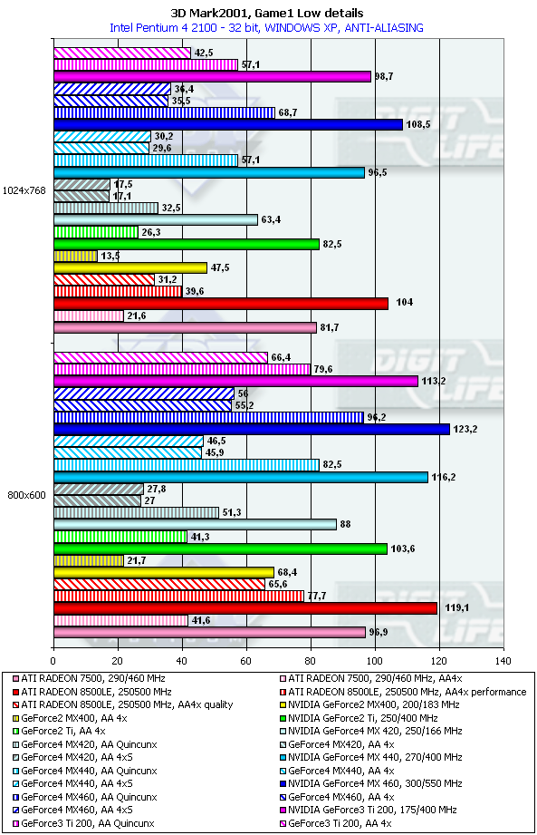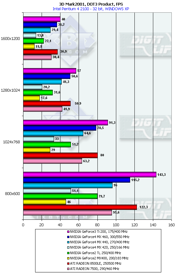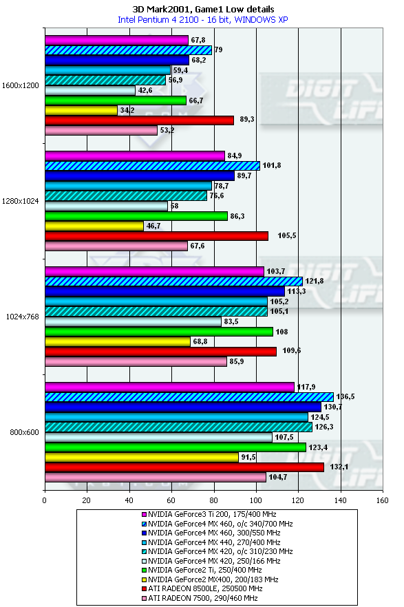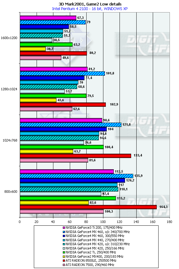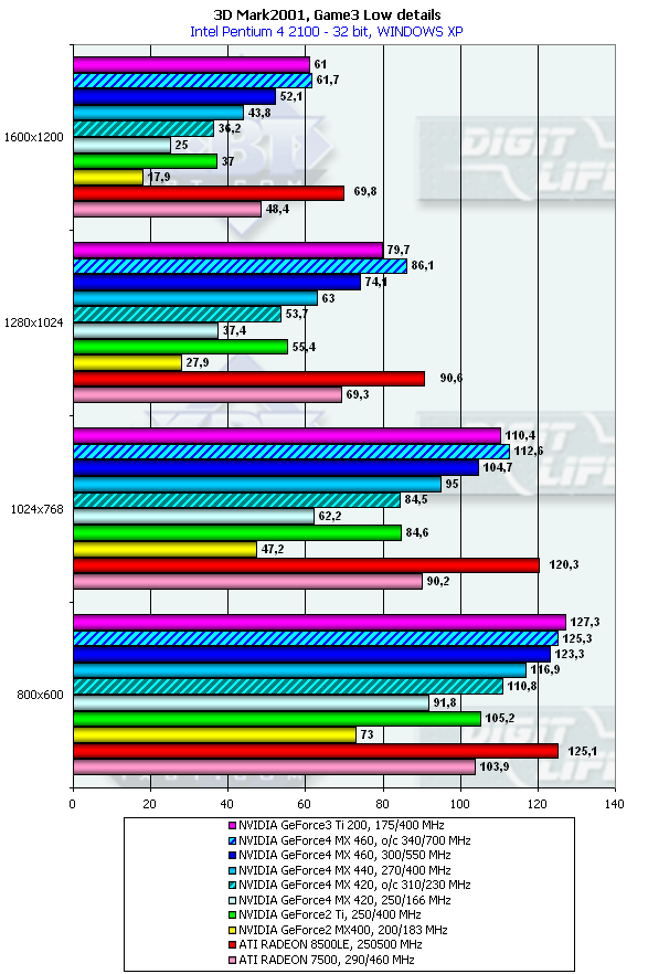 Интересно отметить, что старшая модель MX460 "нос-в-нос" идет с RADEON 8500LE (на младших разрешениях), а GeForce3 Ti 200 безнадежно отстала — сказывается низкая частота ее GPU и, следовательно, ее T&L блока.