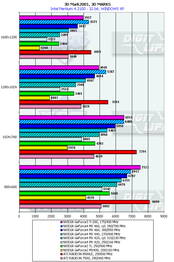 - Предыдущий тезис в отношении MX460 будет верен, только если производители не начнут удешевлять такие платы и не комплектовать более медленной памятью, тогда эта плата явно отстанет по всем статьям от GeForce3 Ti 200.