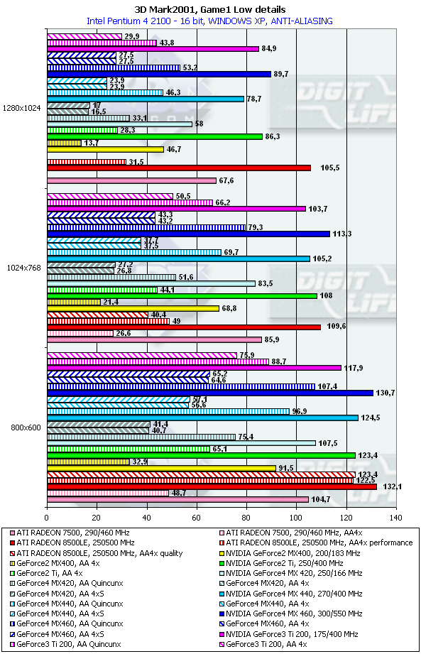 Суммарные результаты говорят, что лидер — RADEON 8500LE, а на втором месте — GeForce3 Ti 200. Новая линейка GeForce4 MX может претендовать только на 3-е место и ниже.