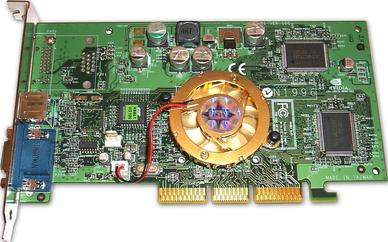 - GeForce 4 MX440 — 270 МГц ядро, 64 МБ 200(400) МГц 128 бит DDR памяти.