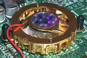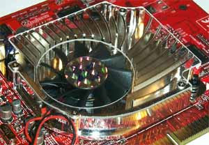 Мы уже отмечали, что на платах класса GeForce4 установлены необычного вида и форм-фактора кулеры. Точно такой же конфигурации кулер имеется и на MSI GFMX460. Различие состоит в окраске и крышке.