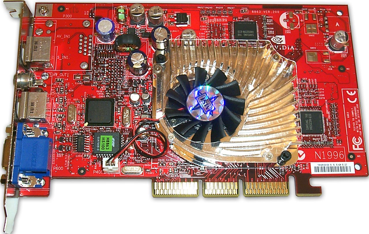 - GeForce 4 MX460 — 300 МГц ядро, 64 МБ 275(550) МГц 128 бит DDR памяти.