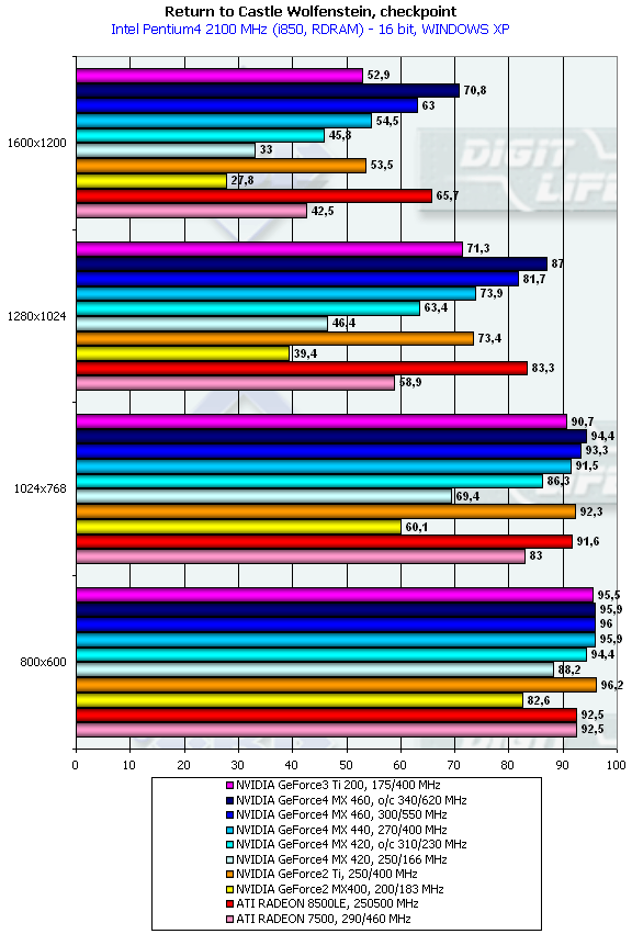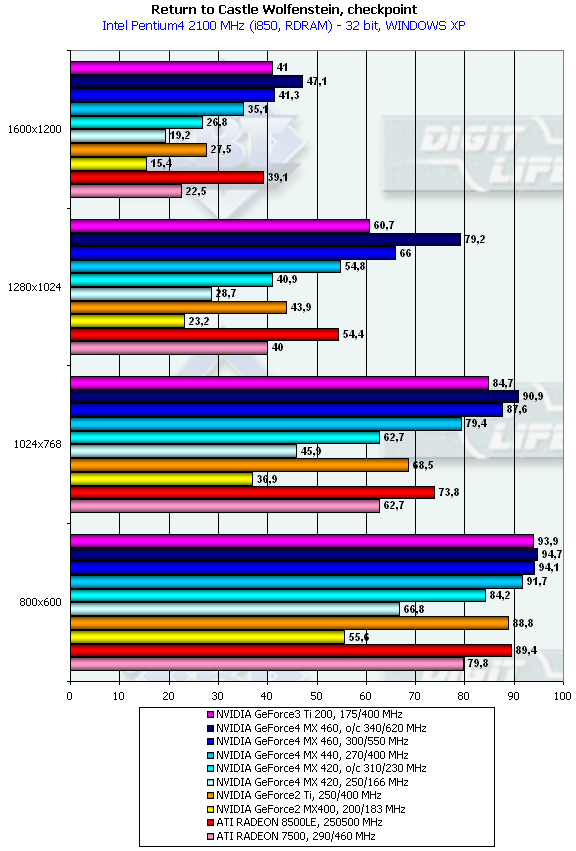 - Return to Castle Wolfenstein (id Software/Activision) игровой тест, демонстрирующий работу плат в OpenGL с использованием демо-бенчмарка Checkpoint.