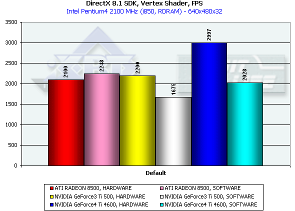 Интересно, что со времени прошлого большого обзора R200 скорость выполнения им вершинных шейдеров выросла более чем вдвое. При этом она подозрительно сравнялась со скоростью программной эмуляции, и в том обзоре мы уже наблюдали подобный скачок у NV20. На этот раз мы вновь решили проверить, не исполняются ли шейдеры R200 программно, и для этого понизили тактовую частоту процессора до 1 ГГц. Результаты (HARDWARE 1860, SOFTWARE 1470) свидетельствуют скорее в пользу истинно аппаратного исполнения. Что ж, ATI тоже не лыком шиты, и вполне успешно выжали из чипа новые соки за счет оптимизации драйверов (вероятно, в первую очередь компилятора шейдеров в микрокод).