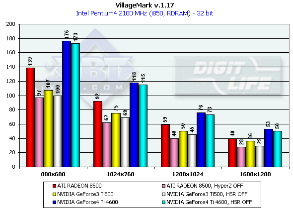 Кроме очевидного преимущества NV25, особенно ярко выраженного в разрешении 1280х1024, в глаза бросается интересный факт — падение производительности при отключенном HSR для NV25 и NV20 очень мало. Особенно по сравнению с R200. Говорит ли это о более низкой эффективности HSR? Нет, и вот почему. Если в случае R200 мы отключаем весь HyperZ, т.е. целый комплекс оптимизаций на основе иерархического представления Z буфера (в том числе, HSR, сжатие Z, быстрая очистка Z), то в случае NVIDIA, как выяснилось при более детальном анализе, нам удалось выключить только сжатие Z, а сам HSR (Z-Cull) в драйверах 27.ХХ на данный момент включен по умолчанию и активируется вне зависимости от состояния ключей в реестре. Как бы там ни было — общая эффективность NV25 в сценах с высоким overdraw налицо.