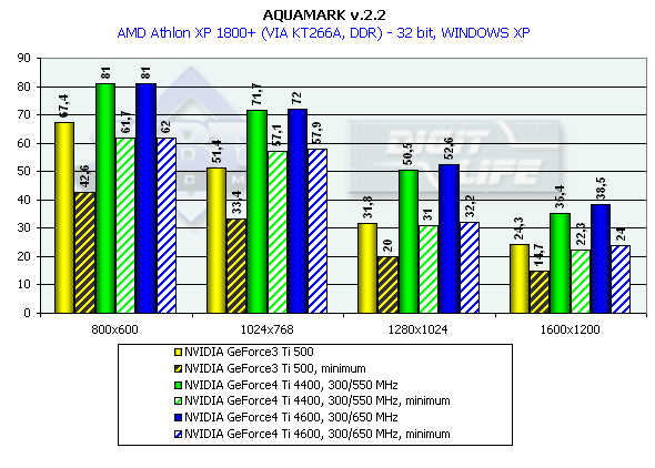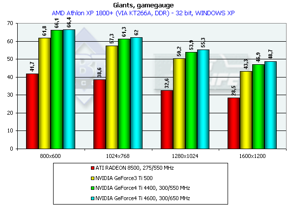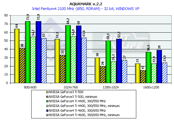 Итоги таковы: в 1600х1200х32 GeForce4 Ti 4400 опередил Ti 500 на 25.6%, а GeForce4 Ti 4600 на 34.6%, что очень даже отлично для GPU, частота которого выше на 25%. Как можно видеть, пропускная способность памяти на таком тесте играет значительную роль (собственно, этим только и отличаются Ti 4400 и 4600).