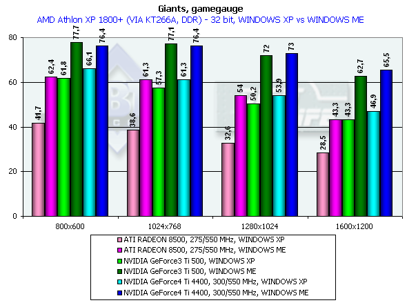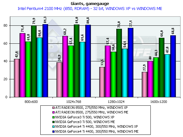 Обратите внимание на то, как заточена эта игра под Windows ME, как вырастает скорость на этой ОС по сравнению с Windows XP. Мы могли бы говорить об отлаженности драйверов, но DirectX — вещь универсальная, и по сути одна и та же в любой ОС (если номер версии DX одинаков). Тем более, что наблюдается удивительная слаженность таких различий у разных ускорителей, что как раз и наводит на мысли, что виноваты уже не драйверы, а сама игра. Впрочем, от этого не легче, иных игровых тестов под DirectX днем-с-огнем не найти.