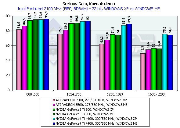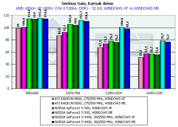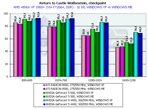 В целом, картина по сравнению производительности в Windows XP и Windows ME схожа с той, что мы видели ранее на примере Quake3.