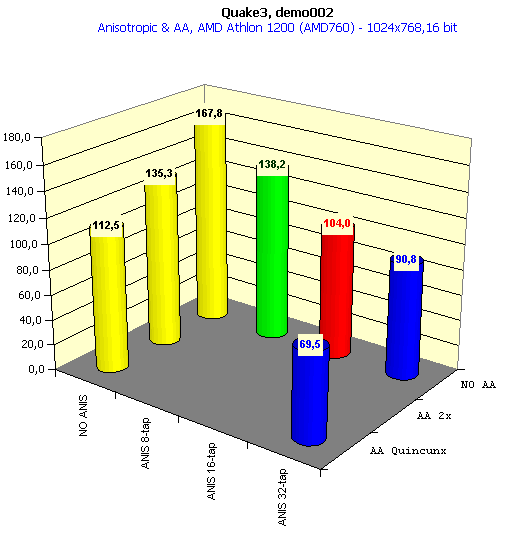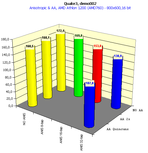 Мы видим, что здесь в 32-битном цвете при активизации 32-точечной анизотропии и АА в режиме Quincunx играбельность уже находится на пределе (хотя для многих игр еще далеко не на минимуме комфорта), поэтому уже можно подумать о возможных компромиссах и снижении степени либо анизотропии, либо АА (предпочтительнее первое).