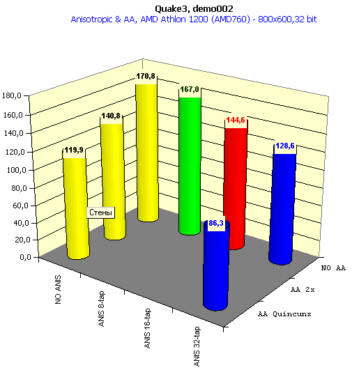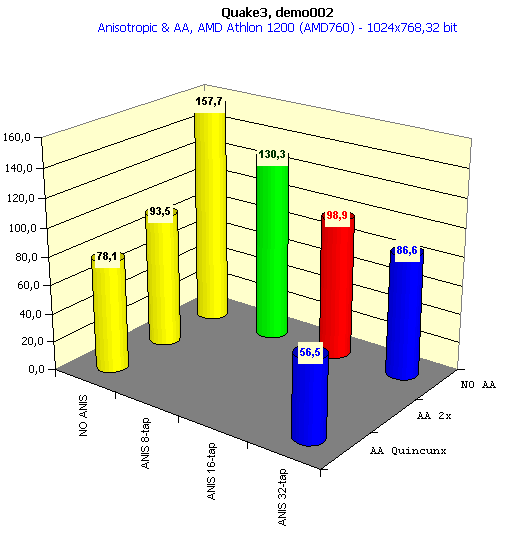 Как известно, GeForce3 поддерживает три степени анизотропной фильтрации (8-, 16- и 32-точечная), а также 3 вида АА, основным из которых является режим Quincunx, обеспечивающий наилучший компромисс между падением производительности и качество анти-алиасинга. До сих пор мы рассматривали эти функции раздельно, вычисляя, сколько FPS поглощает анизотропия или анти-алиасинг. Однако многих интересует работа этих функций совместно. Потянет ли карта такую нагрузку, не будет ли падение производительности катастрофическим? Давайте рассмотрим это все раздельно по разрешениям. Я представил результаты исследования в виде трехмерных диаграмм, по которым можно наглядно видеть влияние АА и анизотропии как отдельно, так и совместно.