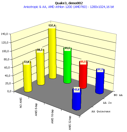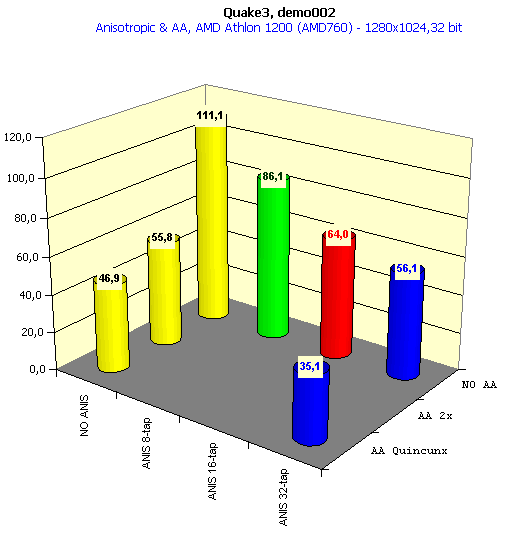 Это разрешение уже заставляет подчас отказываться от активизации какой-либо из 2-х функций, поскольку их совместное использование приводит к низким значениям производительности. Думается мне, что в 1280х1024 уже можно вполне отказаться от АА в пользу анизотропии.