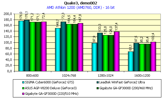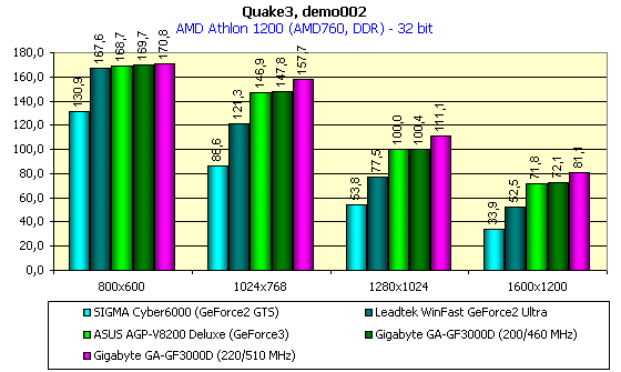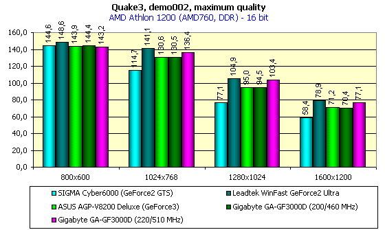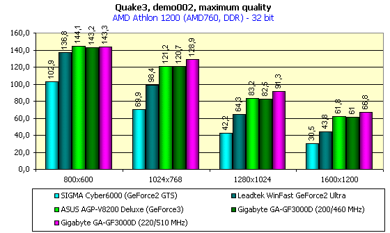 Опыт тестирования предыдущих плат на базе GeForce3 продемонстрировал очень хороший уровень качества в 2D у этих карт. Надо отметить, что Gigabyte GV-GF3000D имеет качество изображения не хуже. То есть, в разрешении 1600х1200 при 75 и даже 85 Гц можно очень комфортно работать при наличии большого монитора.