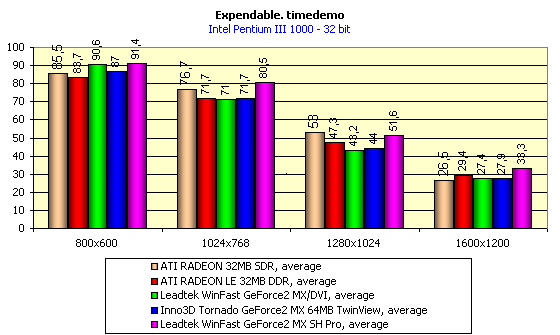 - Хоть это и не относится к теме этой статьи, но хорошо видно, что ATI RADEON LE и ATI RADEON SDR, имея уже даже более низкие цены, чем видеокарты на GeForce2 MX от именитых производителей, выигрывают у последних в производительности в 32-битном цвете.