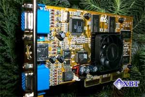 По своему конструктиву плата сильно отличается от эталонного дизайна. Однако некоторые элементы последнего имеются и на этой карте, в частности, расположение TV-out между двумя VGA-гнездами, что можно видеть у всех видеокарт с TwinView. TV-out снабжен S-Video выходом, но в комплект входит переходник S-Video-to-RCA. TV-out поддерживается технологией TwinView, позволяющей одновременный вывод изображения на монитор и на телевизор, а также расширение рабочего стола на два приемника сигнала. Мы уже многократно рассказывали в наших материалах о технологии TwinView, поэтому в этой статье я не стану заострять на этом внимание. Но на этом особенности карты не заканчиваются.