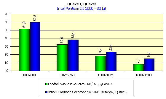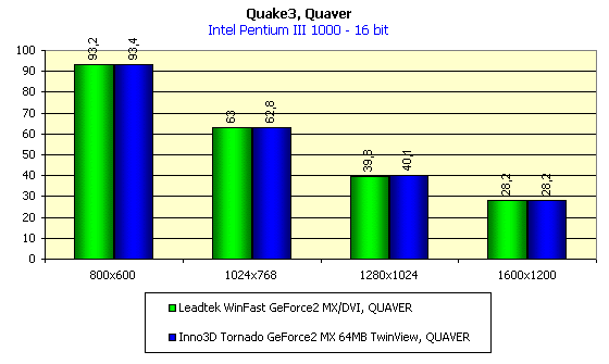 Хорошо видно, что "спагетти" получились не ахти, "пельмени" в виде видеокарты на GeForce2 MX с 5 ns памятью дают больше "сытности", то бишь, производительности в 3D. В самом деле, рядовая видеокарта на этом GPU с 32-мя мегабайтами памяти показывает скорость ничуть не меньше, чем Inno3D Tornado GeForce2 MX 64MB, однако при этом обладая еще неким потенциалом для разгона. А ведь стоимости ныне рассматриваемой карты от Innovision и той же Leadtek WinFast GeForce2 MX SH Pro примерно равны (наличие TwinView безусловно повышает ставки у Inno3D Tornado GeForce2 MX 64MB, однако большинству пользователей от этой технологии потребуется лишь TV-out). Ну а где здесь польза от 64-х мегабайт памяти? Давайте посмотрим на Quaver: