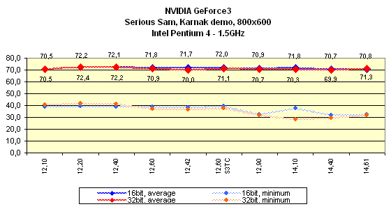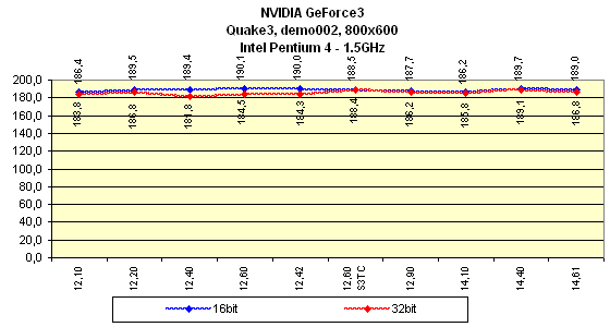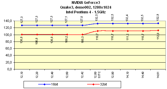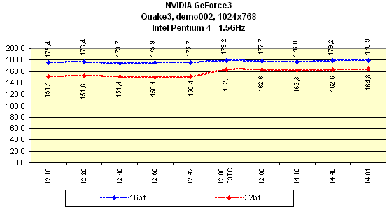 Как можно видеть, совершенствование драйверов для новейшего продукта NVIDIA приводит к снижению числа артефактов в играх, однако при этом иногда чуть падает производительность. Хотя последняя версия 14.61 очень хороша. Из-за того, что мы стали использовать возможности технологии компрессии текстур S3TC, версия 12.60 представлена дважды: без и с использованием S3TC.