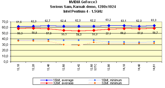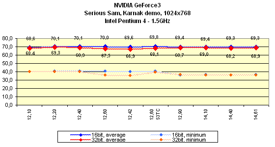 Падение производительности в Serious Sam на предыдущих версиях драйверов вызвано тем, что ранее мы использовали установки, выставляемые игрой по умолчанию в режиме Quality, однако при работе в 32-битном цвете все же не все эффекты имели заданную глубину цвета, поэтому при новом тестировании мы стали принудительно задавать 100-процентное использование соответствующих глубин цвета во всех настройках.