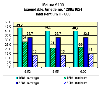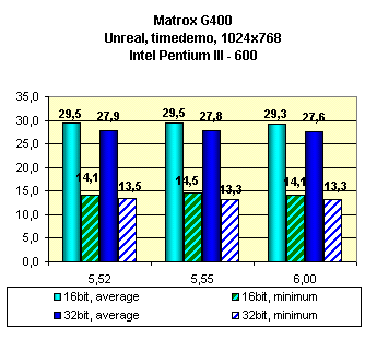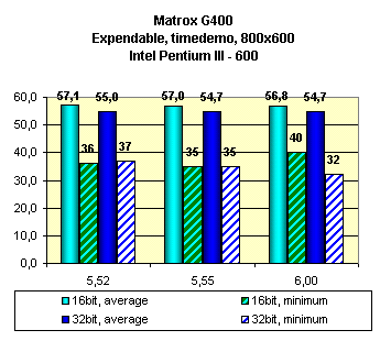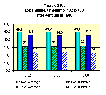Как можно видеть, последняя версия драйверов 6.00 ничего хорошего не принесла, скорость упала или иногда оставалась на прежнем уровне. Работу TurboGL читатель может оценить на сводных диаграммах. Что же касаемо EMBM, то налицо довольно сильное падение в скорости при включении этой функции. Красота требует жертв, и ничего не поделать.