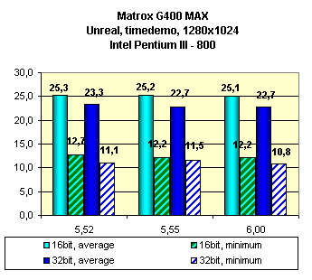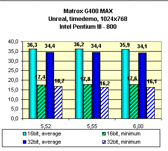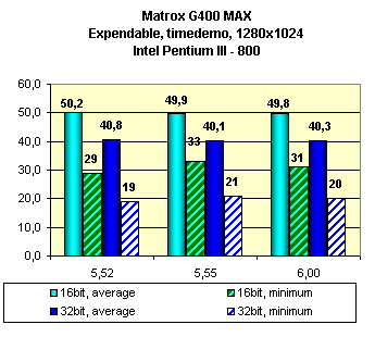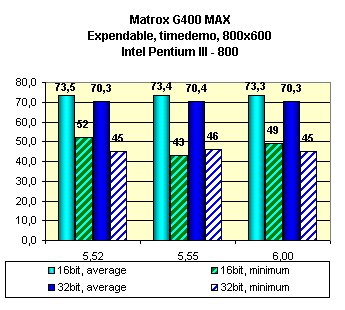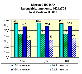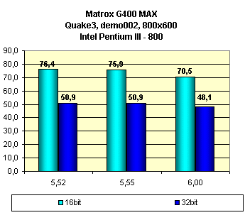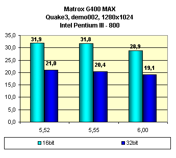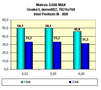 Ситуация очень похожа на ту, что видим у карты на чипсете G400. Как можно видеть, последняя версия драйверов 6.00 ничего хорошего не принесла, скорость упала или иногда оставалась на прежнем уровне.
