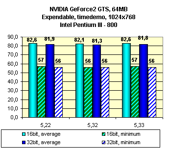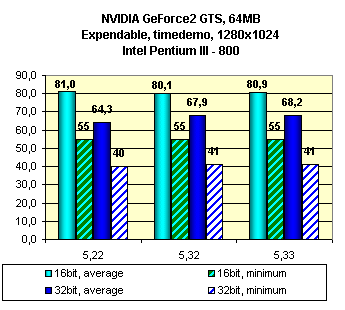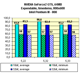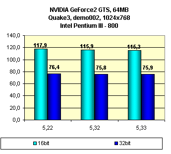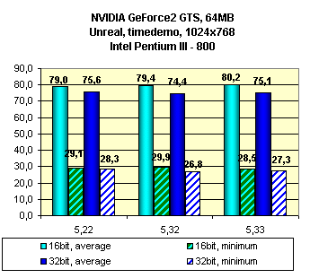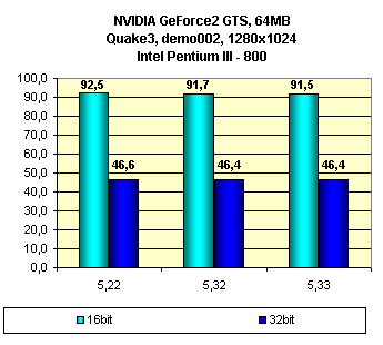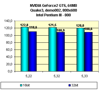 Как можно видеть, смена версий драйверов у этой карты ничего не дает. Поэтому можно выбирать любую нравящуюся версию. Из соображений надежности могу посоветовать пользоваться версией 5.22, так как это официально вышедшая версия, но вместе с тем желающим воспользоваться FSAA я рекомендую версию 5.33, так как в этой версии работа FSAA более отлажена, и падение производительности уже поменьше. В сводных диаграммах можно увидеть результаты по производительности видеокарт на этом чипсете при включенном FSAA.