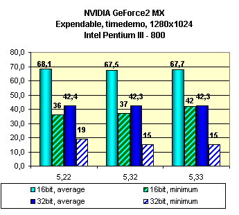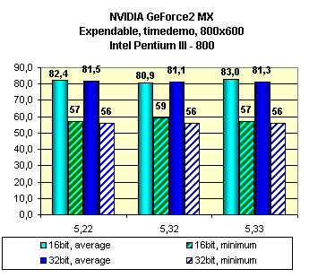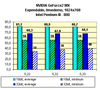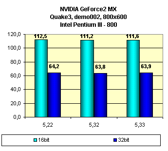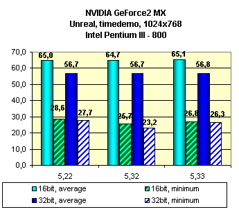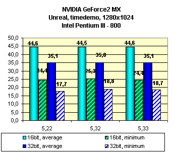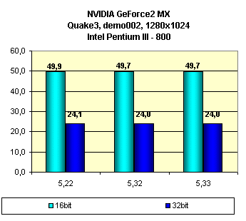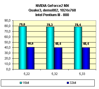 Как можно видеть, смена версий драйверов у этой карты ничего не дает. Поэтому можно выбирать любую нравящуюся версию. Из соображений надежности могу посоветовать пользоваться версией 5.22, так как это официально вышедшая версия. Ждем детонаторы серии 6.1x, на которых будут работать дополнительные функции этой карты, например, TwinView.