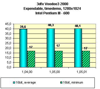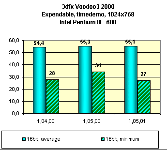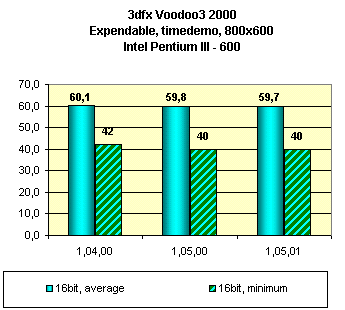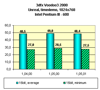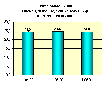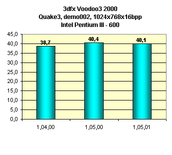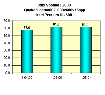 Как мы видим, последняя версия драйверов от 3dfx 1.05.01 дает приросты по скорости, правда не везде. Хочу также отметить возросшее качество картинки в 3D, которое мы можем иметь начиная с версий 1.05.00. Тем не менее, артефакты имеются. Прежде всего хочу отметить отсутствие честной трилинейной фильтрации в играх типа Quake3 даже при выключении мультитекстурирования.