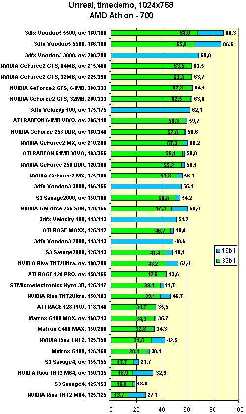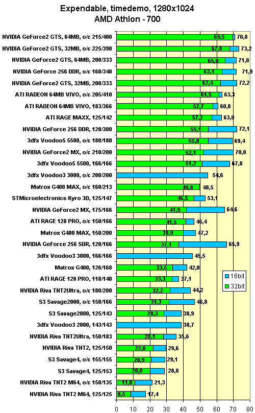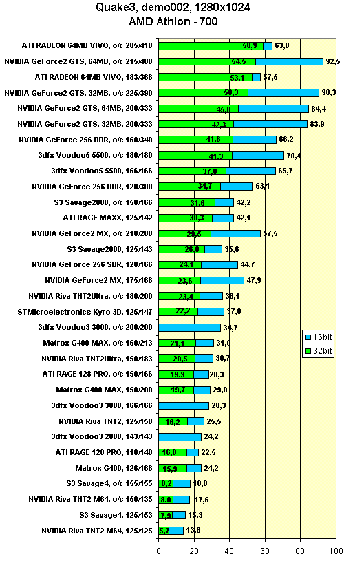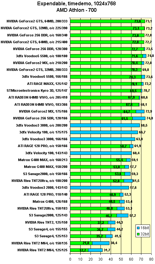 - сводная диаграмма по всем видеокартам на базе стенда на Athlon — 700 MHz.
