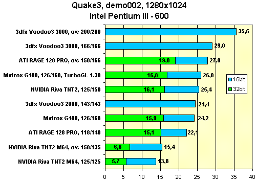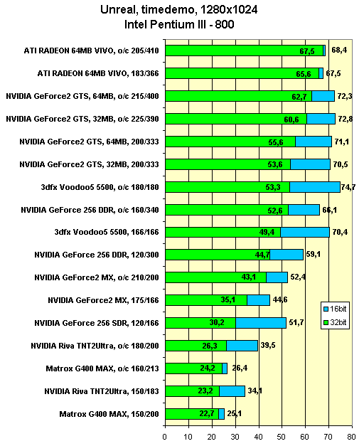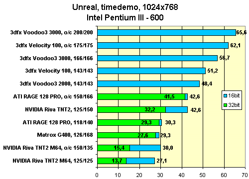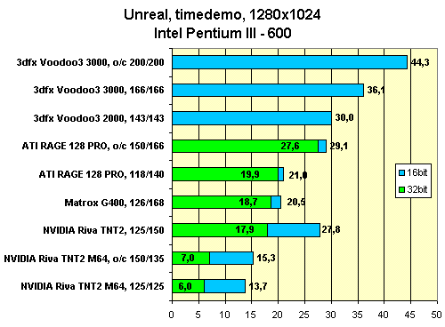 - скорость работы 16-меговых и 32-меговых видеокарт на S3 Savage4, ATI RAGE 128 PRO, NVIDIA Riva TNT2 M64, Riva TNT2 примерно равны.