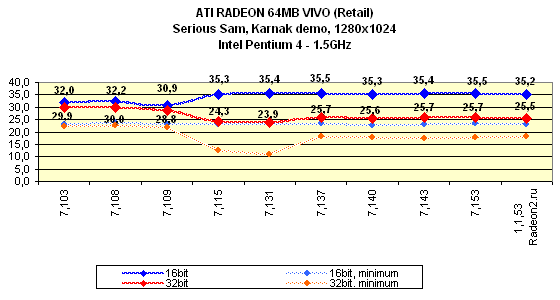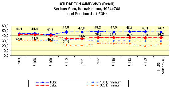 Небезынтересно отметить то, что появилась первая игра, которая умеет использовать три текстурных блока на конвейере рендеринга, это Serious Sam. Игра автоматически определяет эту особенность RADEON и выставляет triple texturing. Поэтому во всех тестах, проведенных на основе этой игры, RADEON работает на полную катушку. Однако все же интересно проследить, что дает включение трех TMU вместо широко распространенных двух текстурников на конвейере: