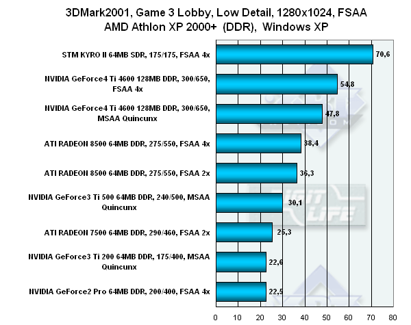 3DGiТоги апреля 2002 года: 3DMark2001, Game3 — Low details, AthlonXP, 1280x1024, FSAA, Windows XP