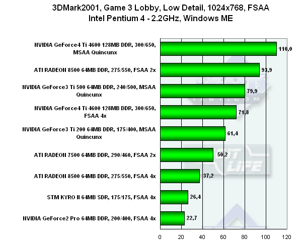 3DGiТоги апреля 2002 года: 3DMark2001, Game3 — Low details, Pentium 4, 1024x768, FSAA, Windows ME