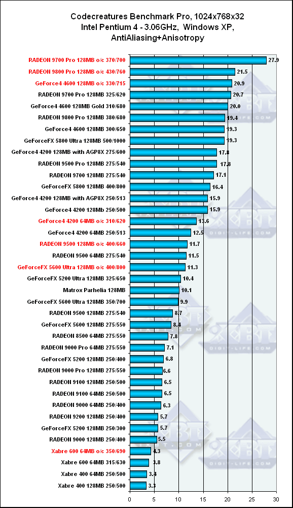 3DGiТоги, апрель 2003 года: Codecreatures Benchmark Pro, Pentium 4, 1024x768, AntiAliasing+Anisotropy, Windows XP