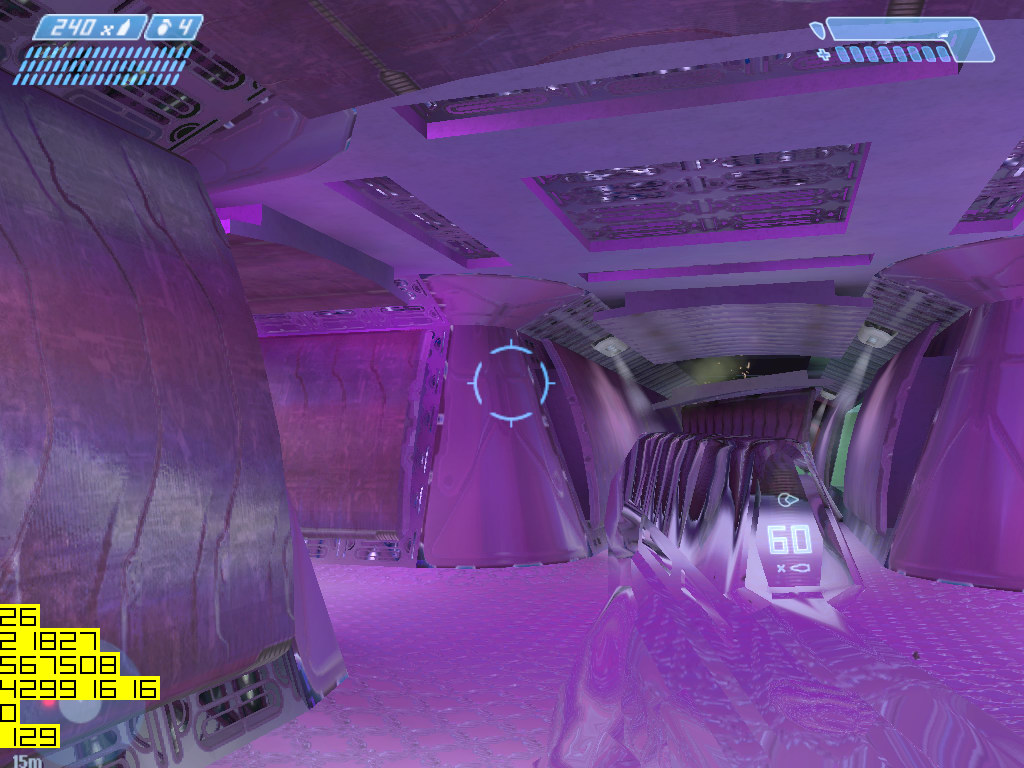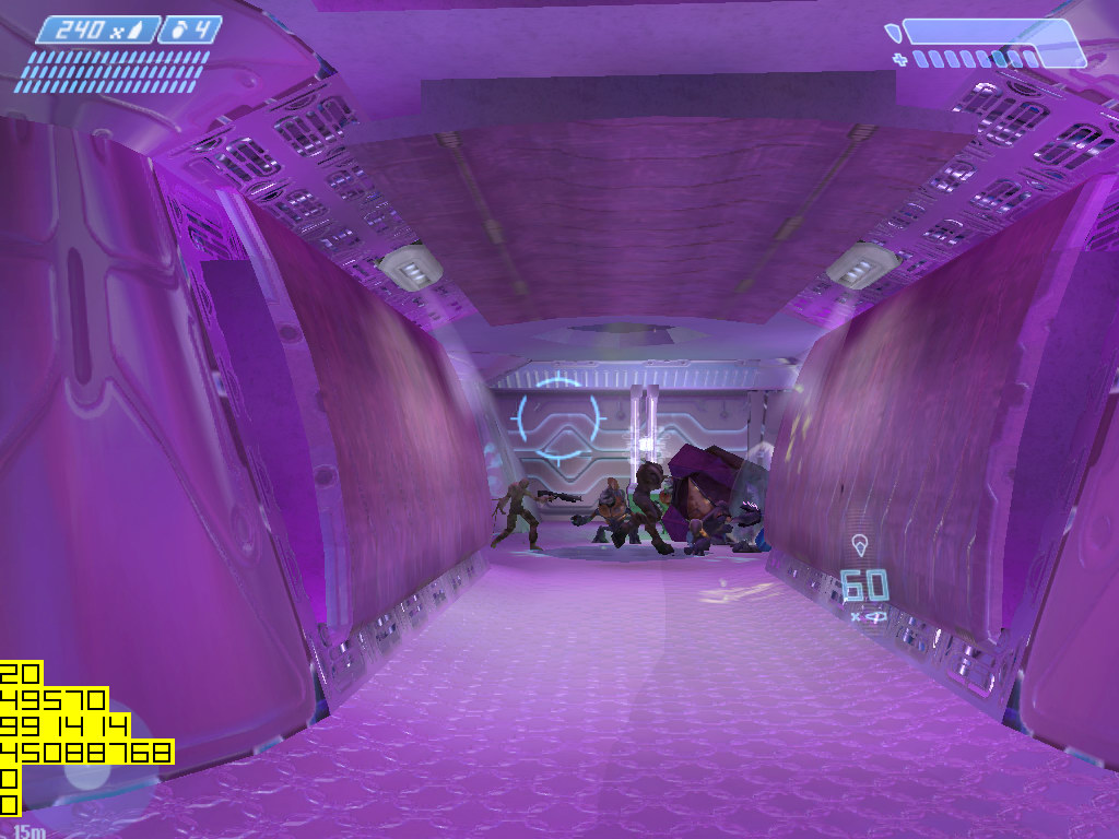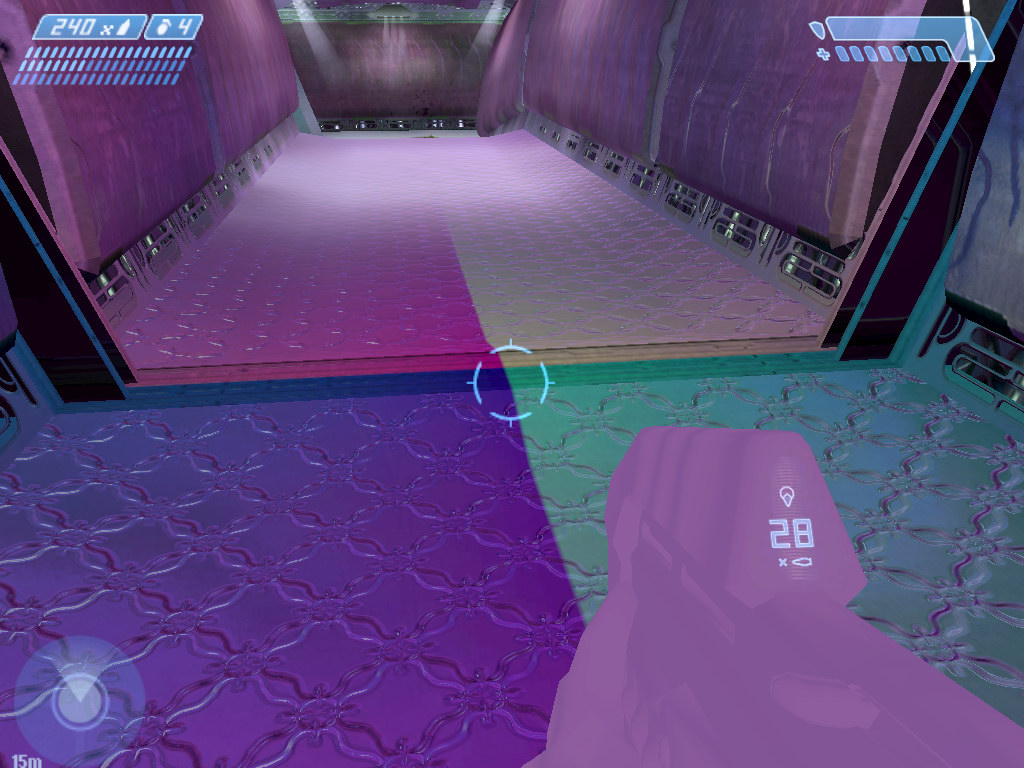 GeForce FX 5200 GeForce FX 5600 Ultra GeForce FX 5700 Ultra GeForce FX 5900 | все версии | Эффект термокамуфляжа на видеокартах семейства GeForce FX становится похожим на этот же эффект на видеокартах Radeon, если заставить Halo думать (при помощи 3DAnalyser), что она работает на видеокарте на базе чипа Radeon. Интереснее всего то, что, на наш взгляд, частота кадров в игре от этого ничуть не уменьшается. (Справа — скриншоты с GFFX5900 с DeviceID от Radeon 9800 Pro.) |