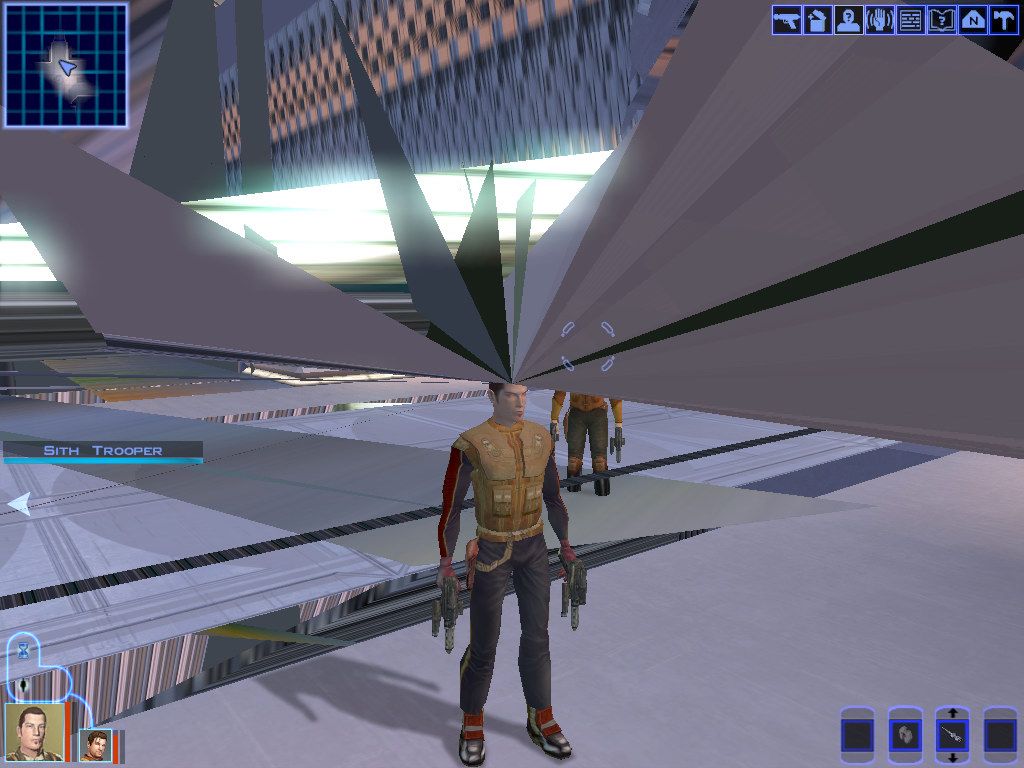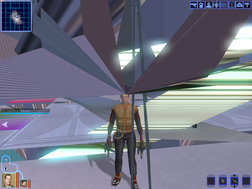 Необходимо помнить, что на видеокартах от NVIDIA, начиная с GF3 и выше, игра использует технологию shadow mapping, позволяющую достичь существенно более высокой детализации теней (по крайней мере, в этой игре). На картах уровня GF4MX и на всех без исключений Radeon используются projected textures существенно менее высокого разрешения. Разница отлично видна на скриншотах качества. Но что интереснее всего: особенности shadow mapping в SC приводят к тому, что на GF3+ игра заметно более светлая, что автоматически делает ее заметно более сложной уже не так просто с умным видом красться по теням. На скриншотах опять же видна разница в освещении одного и того же места по «светомеру» в правом нижнем углу. | |