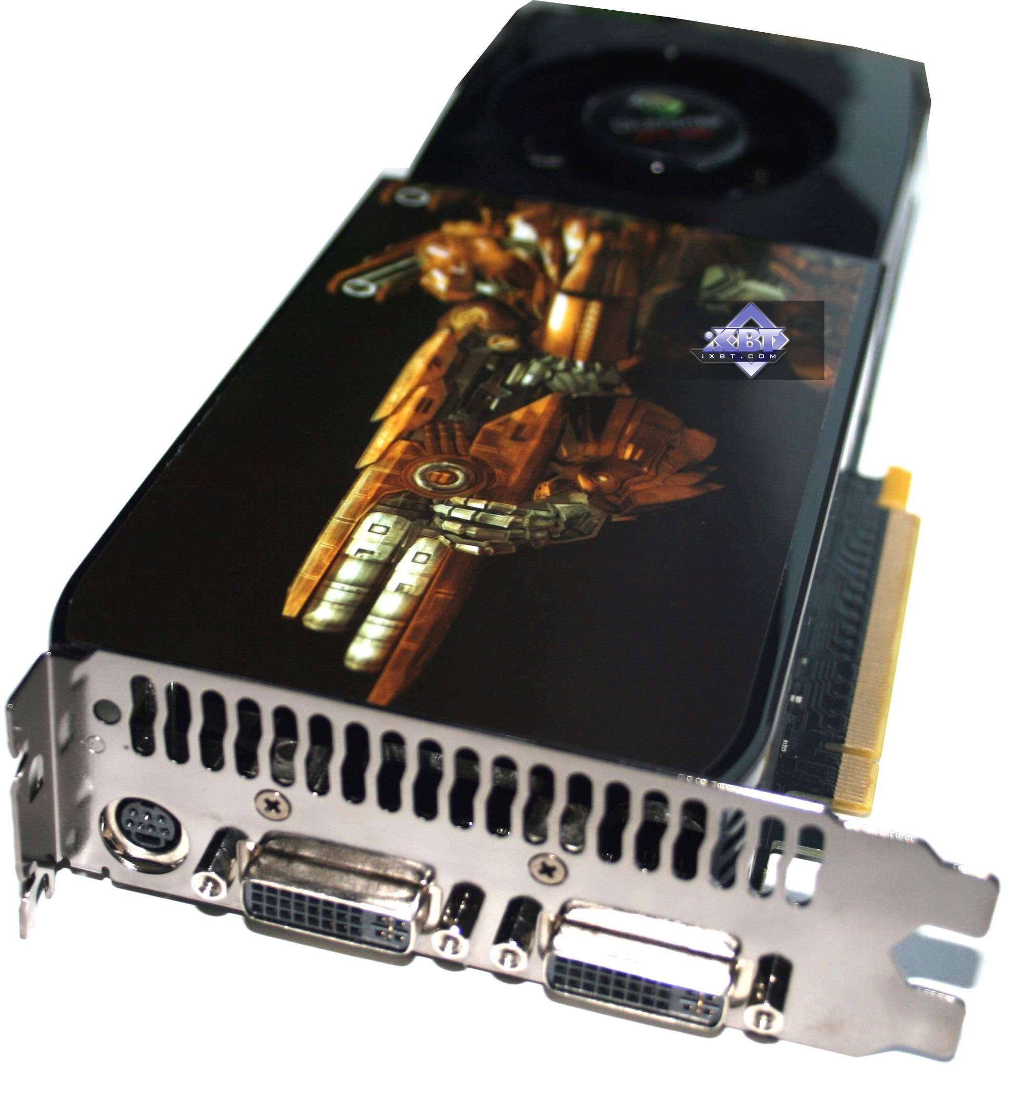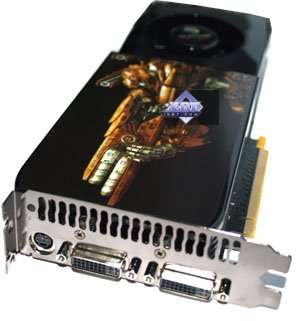 Напоминаем еще раз важный момент: длина ускорителя - 270 мм, как у 8800 GTX/Ultra, поэтому в корпусе должно быть достаточно места для установки такой конструкции. А также обратим внимание на ширину кожуха, которая неизменна вдоль всей длины, а следовательно на материнской плате за PCI-E x16 разъемом не должно быть никаких портов и высоких конденсаторов, причем на ширину 30 мм (то есть не только за самим слотом PCI-E, но за соседним с ним не должно быть никаких высоких частей на системной плате).