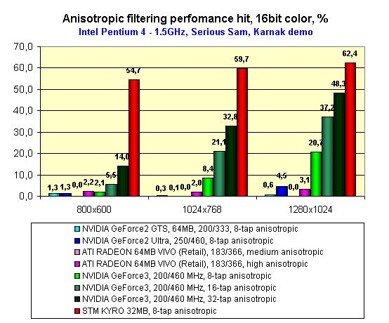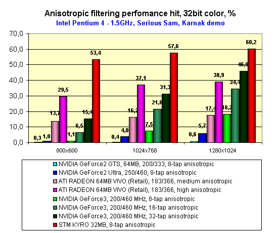 Как мы видим, качество анизотропии максимальной степени у RADEON выше, чем у GeForce2-карт, однако и падение производительности у RADEON гораздо более значительное.