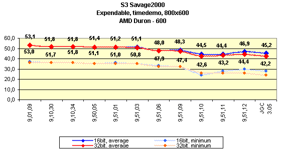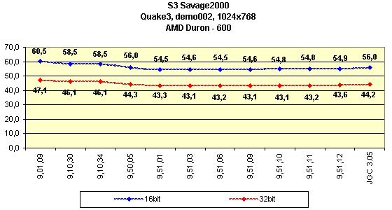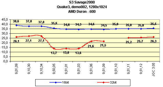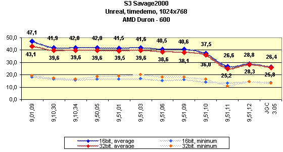 Видно, что ситуация очень неоднозначная, есть взлеты и падения на разных версиях, однако четко прослеживается тенденция к падению скорости при росте номеров версий драйверов. И уж особенно плохо стало на последних версиях, которую уже выпускали не программисты из Diamond, а бывшей S3. Они угробили Savage4, дотянули свои руки до Savage2000, и вообще бросили эти чипсеты :-(. Поэтому есть смысл использовать либо версию до номер 9.51.09 включительно, если вы работаете на i815-платформе, либо 9.51.03-версию на остальных платформах. И надо отметить, что на последних версиях драйверов эта карта требует принудительной установки AGP в 2х.