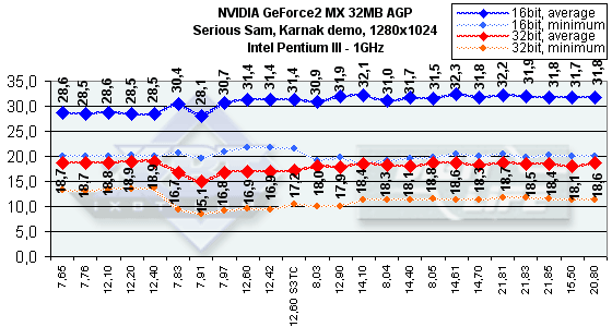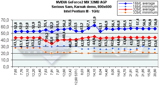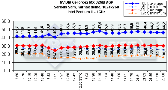 Падение производительности в Serious Sam на предыдущих версиях драйверов вызвано тем, что ранее мы использовали установки, выставляемые игрой по умолчанию в режиме Quality, однако при работе в 32-битном цвете все же не все эффекты имели заданную глубину цвета, поэтому при новом тестировании мы стали принудительно задавать 100-процентное использование соответствующих глубин цвета во всех настройках.