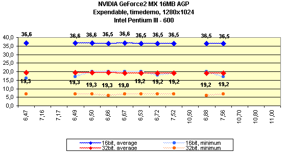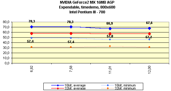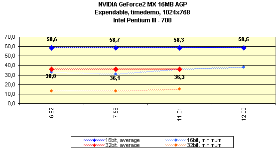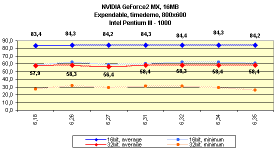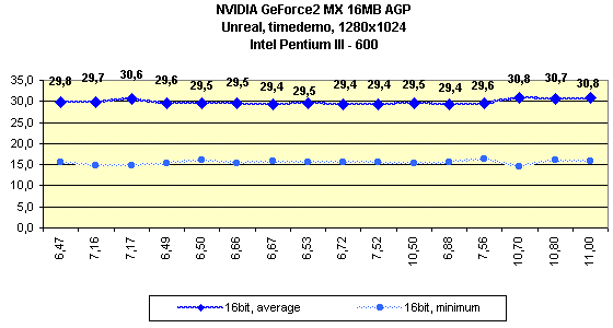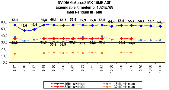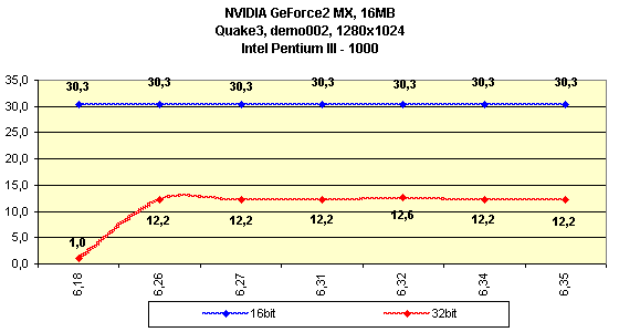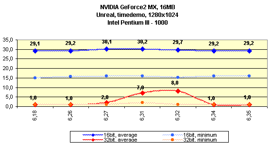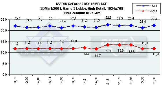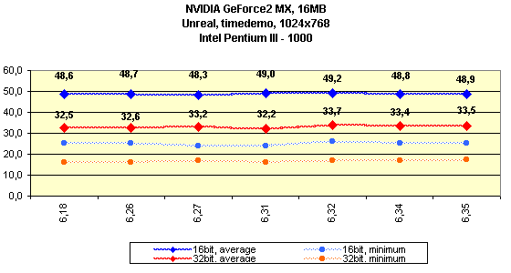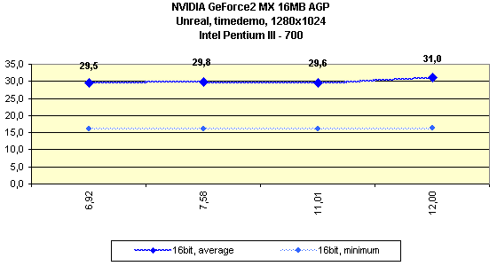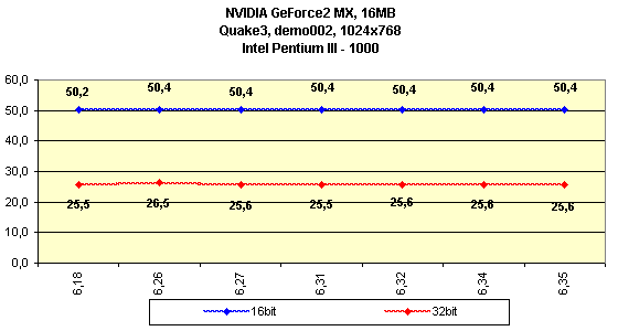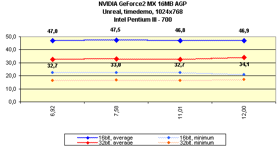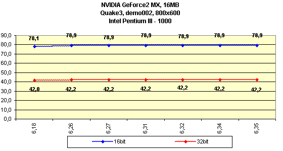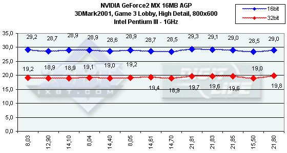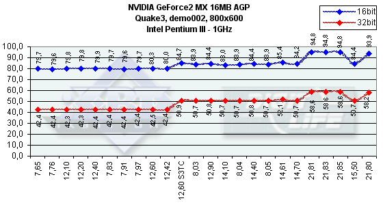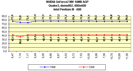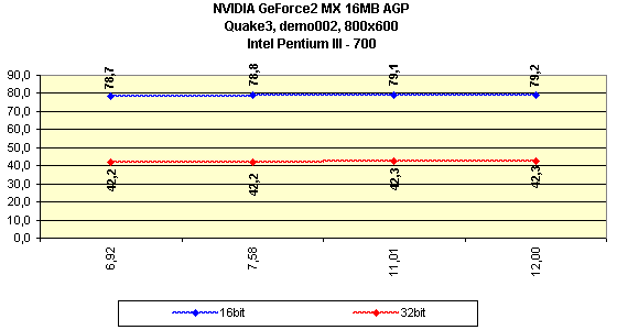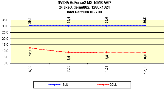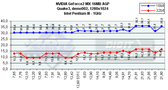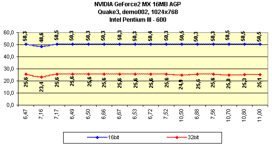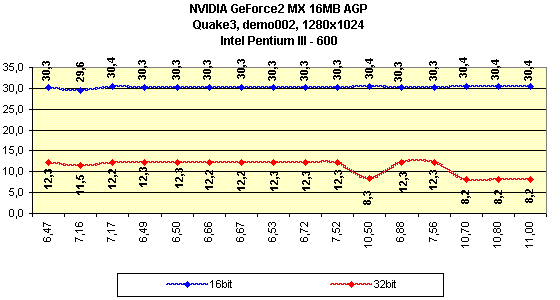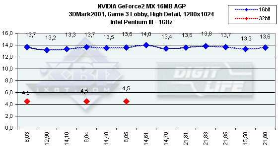 Начать я хочу с громкого ПРЕДУПРЕЖДЕНИЯ! Я прошу читателей обратить внимание на данную видеокарту, поскольку в отличие от многих других видеокарт, выпускаемых как в 16-ти, так и в 32-мегабайтом варианте, данная плата от своего 32 МБ собрата отличается очень сильно, прежде всего, урезанной до 64 бит шиной обмена графического процессора с локальной видеопамятью. Из фотографии выше видно, что для выпуска этой платы использовался тот же дизайн PCB, что и для 32 Мб варианта. Просто не припаяли 2 микросхемы памяти, изменили BIOS у карты для работы с 16-ю Мб памяти, и все. Учитывая тот факт, что данным дизайном PCB предусмотрена 128-битная шина обмена с памятью только при наличии 4-х микросхем подобного класса, при отсутствии половины из них ширина шины также уменьшается в 2 раза. Это приводит к просто катастрофическим результатам. Из сводных диаграмм видно, что плата на GeForce2 MX 16MB уступила по скорости не только своим собратьям по семейству NVIDIA GeForce256/GeForce2 MX, но даже и NVIDIA Riva TNT2! Падение относительно 32 Мб варианта в некоторых разрешениях более чем в 2 раза. При этом цена на подобные карты лишь незначительно ниже. Хочу обратить внимание также на то, что графический чип, используемый в подобных картах, точно такой же, как и на 32 Мб платах, а не урезанный, как, например, NVIDIA Riva TNT2M64 по сравнению с Riva TNT2: