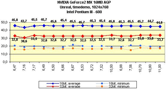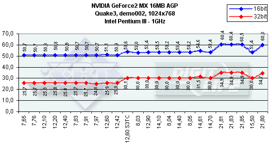 Я хочу обратить внимание пользователей на версии 7.16 и 7.17. Это очень сырое программное обеспечение, которое не тянет даже на звание бета-версии. Как видим, Direct3D-игры показывают сильное падение по скорости. К тому же на этих версиях замечено очень много артефактов визуального плана. 6.66, 6.67 и 12.41WHQL версии драйверов поставляются с NVCPL.DLL, которая "не знает волшебной переменной Coolbits", что дает возможность появления в настройках дисплея регулировок частот и VSync в Direct3D. Из-за того, что мы стали использовать возможности технологии компрессии текстур S3TC, версия 12.60 представлена дважды: без и с использованием S3TC. А с последними версиями драйверов ситуация вообще неоднозначная, хотя в ряде игр 14.* драйверы продемонстрировали более высокую производительность, хотя и при ряде отрицательных моментов неработоспособности некоторых разрешений. Это все не касается версий 21.*, которые продемонстрировали, что даже такой кастрат может прибавить в скорости засчет оптимизаций.