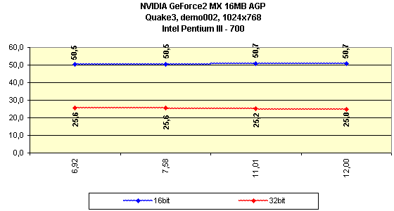Пропускная способность памяти сводит на нет все мощностные возможности GeForce2 MX. Таким образом, еще задолго до появления видеокарт на GeForce2 MX200, 16-мегабайтный вариант подобных карт уже существовал. Более того, на коробке из-под ASUS V7100/16 можно прочитать все характеристики именно 32 Мб карты, в том числе и величину пропускной способности памяти в 2,7 гигабайта в секунду, что является ложью. На лицевой стороне коробки есть только наклейка "16MB", и все, больше никакой пояснительной информации. Я никому не советую покупать такие видеокарты, если вы рассчитываете на высокую скорость работы.