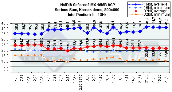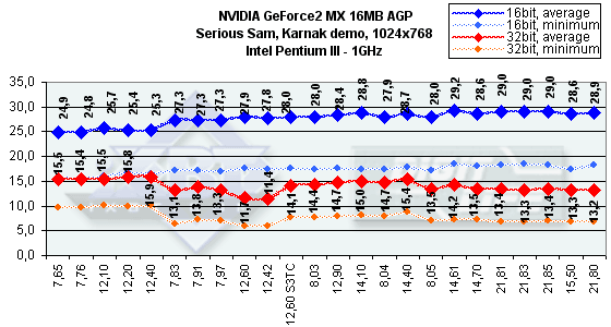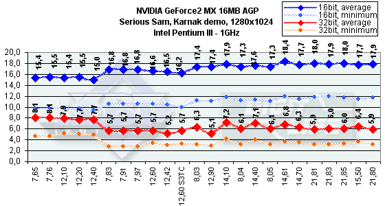 Падение производительности в Serious Sam на предпоследних драйверах вызвано тем, что ранее мы использовали установки, выставляемые игрой по умолчанию в режиме Quality, однако при работе в 32-битном цвете все же не все эффекты имели заданную глубину цвета, поэтому при новом тестировании мы стали принудительно задавать 100-процентное использование соответствующих глубин цвета во всех настройках.