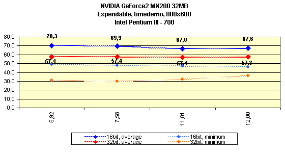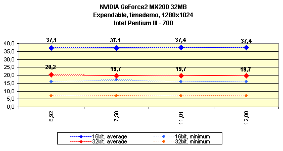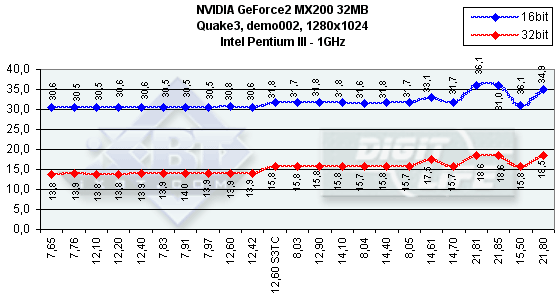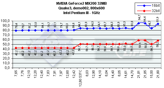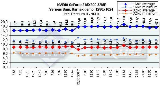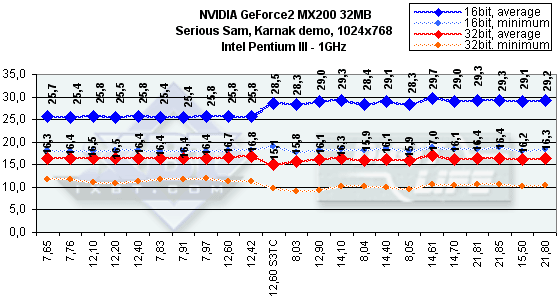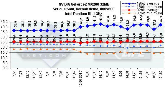 Как видим, различий между ранними версиями драйверов практически нет. Должен отметить, что эта карта наотрез отказалась работать на платформе Intel Pentium4. Надеюсь, что SUMA в скором времени исправит эту ошибку. Из-за того, что мы стали использовать возможности технологии компрессии текстур S3TC, версия 12.60 представлена дважды: без и с использованием S3TC. Последние версии из серии 14.* продемонстрировали рост производительности (особенно на версии 14.61) почти во всех случаях (кроме разве лишь разрешения 800х600 в Serious Sam), поэтому эти версии весьма предпочтительны. Однако самыми привлекательными версиями по праву могут стать 21.* (кроме имеющей проблемы с качеством 21.81), которые показали, что оптимизация может поднять скорость даже таким сильно урезанным картам.