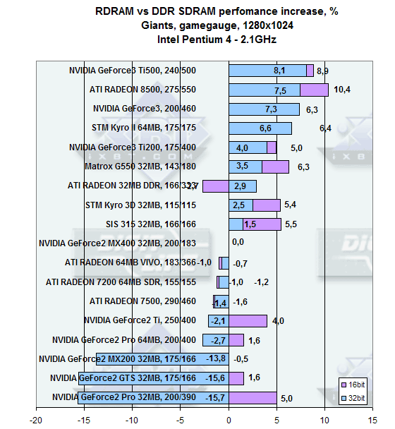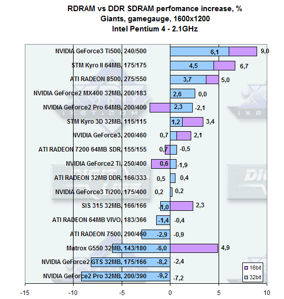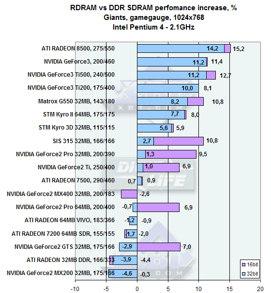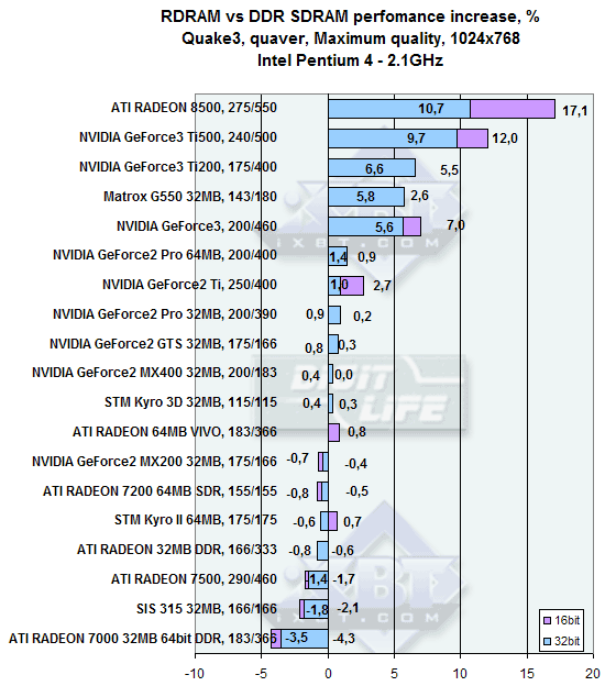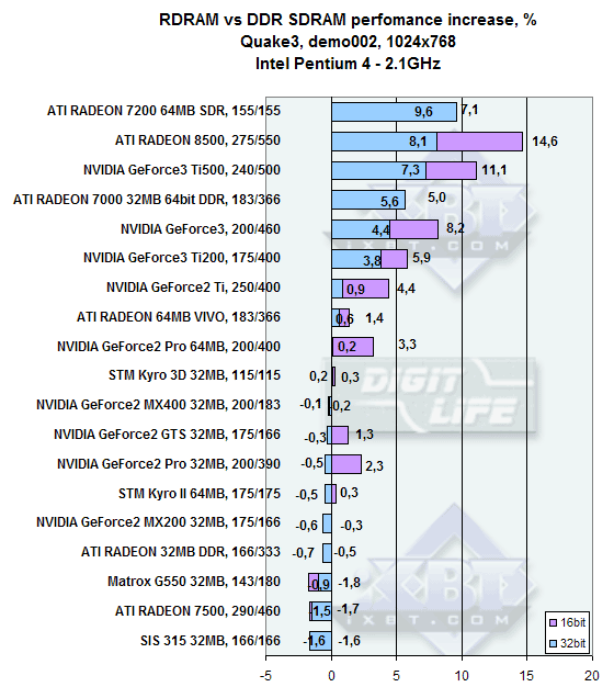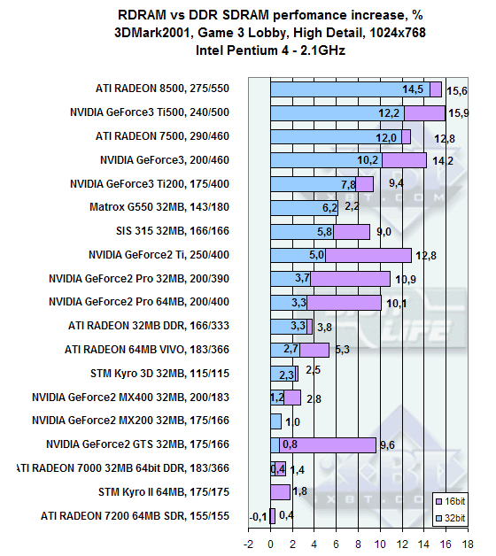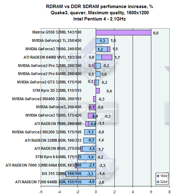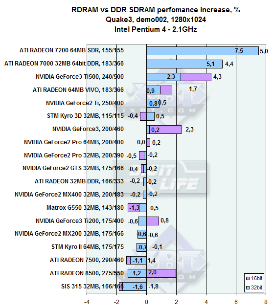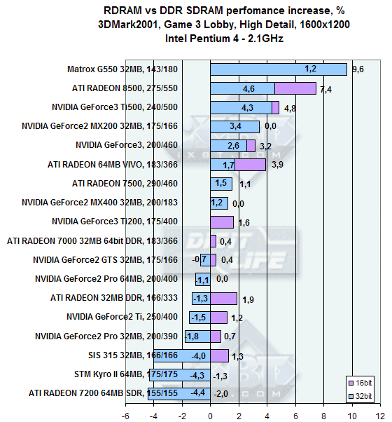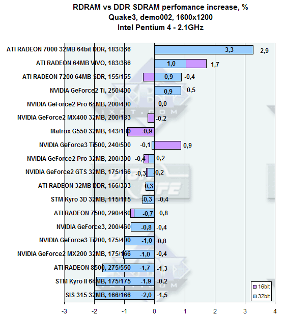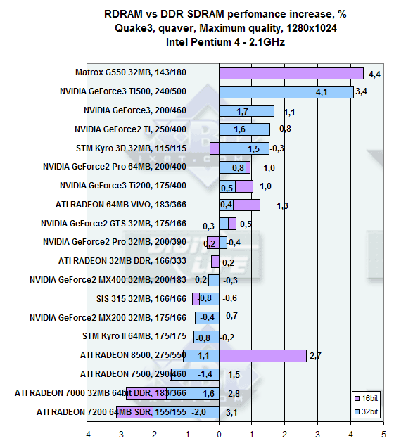 Я напомню, что платформа VIA P4X266 для Pentium4 подразумевает использование DDR-памяти вместо дорогой еще пока RDRAM, однако при этом пропускная способность даже такой "ускоренной" памяти все равно ниже, чем обеспечивается RDRAM PC800. Однако, наши тесты показали, что на примере ряда игр конечная разница в производительности не столь существенна, а иногда и даже случаются обратные случаи превышения производительности карт на платформе VIA P4X266 над i850. Хотя есть и сильные приросты от использования i850, и существенные победы DDR SDRAM-платформы. Вот так все неоднозначно. Заметим, что большинство GeForce - карт выигрывают на i850-платформе, а вот мощные RADEON-ы - наоборот.