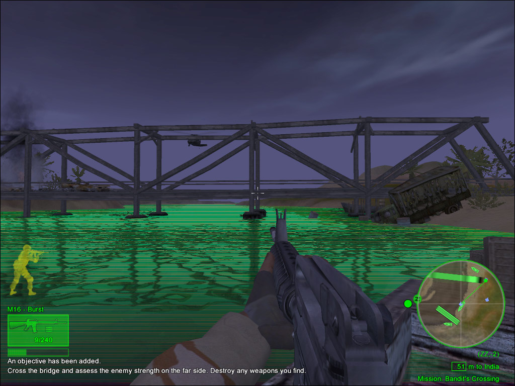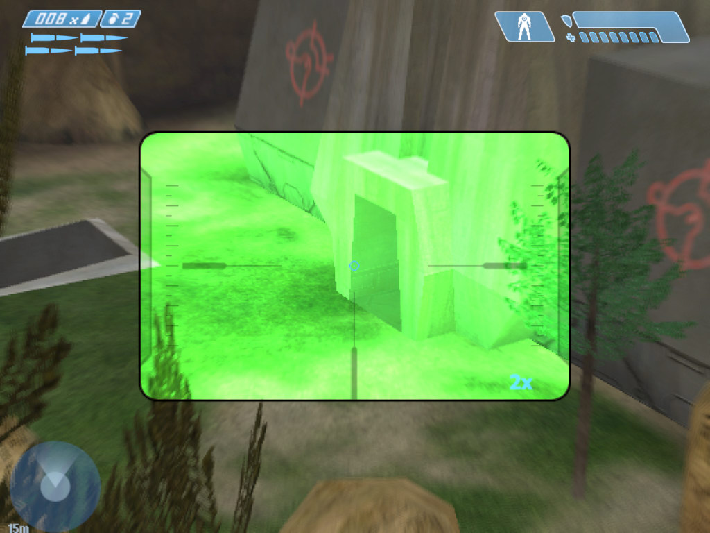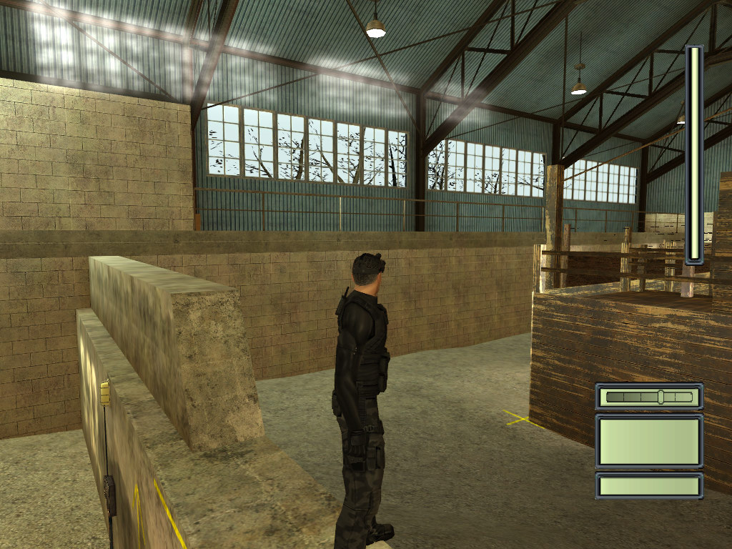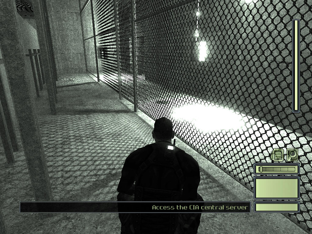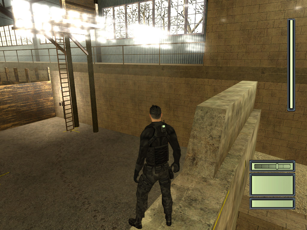 | Необходимо помнить, что на видеокартах от NVIDIA, начиная с GF3 и выше, игра использует технологию shadow mapping, позволяющую достичь существенно более высокой детализации теней (по крайней мере, в этой игре). На картах уровня GF4MX и на всех без исключений Radeon используются projected textures существенно менее высокого разрешения. Разница отлично видна на скриншотах качества. Но что интереснее всего: особенности shadow mapping в SC приводят к тому, что на GF3+ игра заметно более светлая, что автоматически делает ее заметно более сложной  уже не так просто с умным видом красться по теням. На скриншотах опять же видна разница в освещении одного и того же места по «светомеру» в правом нижнем углу. |