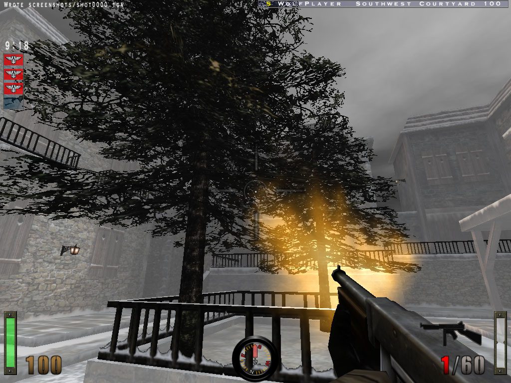 | Периодически, в зависимости от положения камеры, «засвечивается» вся архитектура уровня. Судя по всему, какие-то проблемы с лайтмэпами.  Кажется, баг встречается только в мультиплеерной части RtCW. |  |