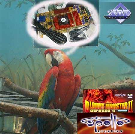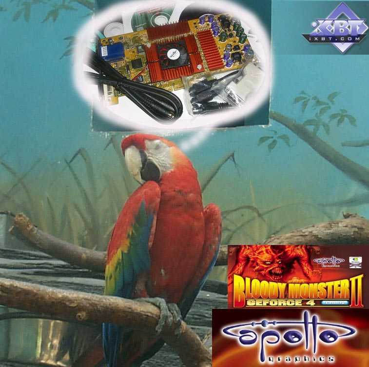 Кроме VIVO, по стандарту для GeForce4 Ti Apollo Bloody Monster II GeForce4 Ti 4600 оборудована еще двумя гнездами: VGA и DVI. О возможностях вывода на два монитора и nView мы уже писали ранее.