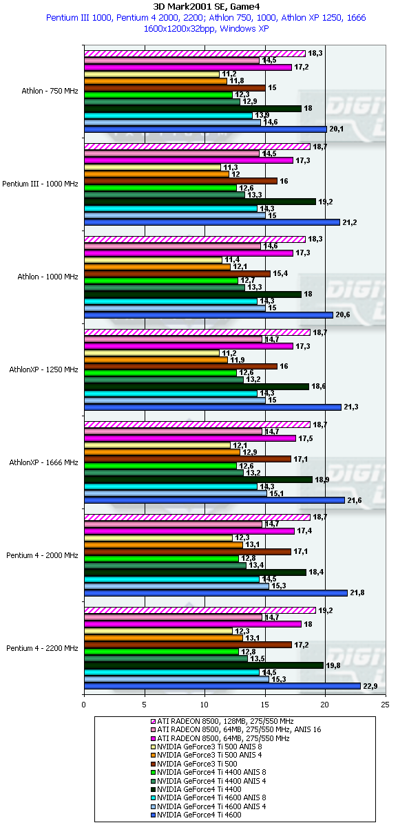 И только это разрешение продемонстрировало, что "силы" у RADEON 8500 "иссякли", и Ti 4600 смогла догнать последнюю при активной анизотропии.